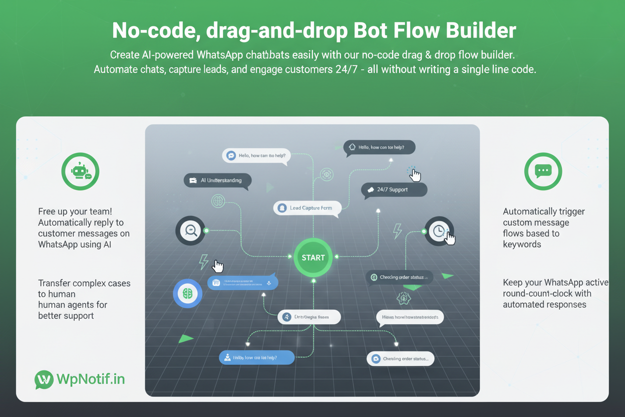 Create AI-powered WhatsApp chatbots easily with our no-code drag & drop flow builder. Automate chats, capture leads, and engage customers 24 7.